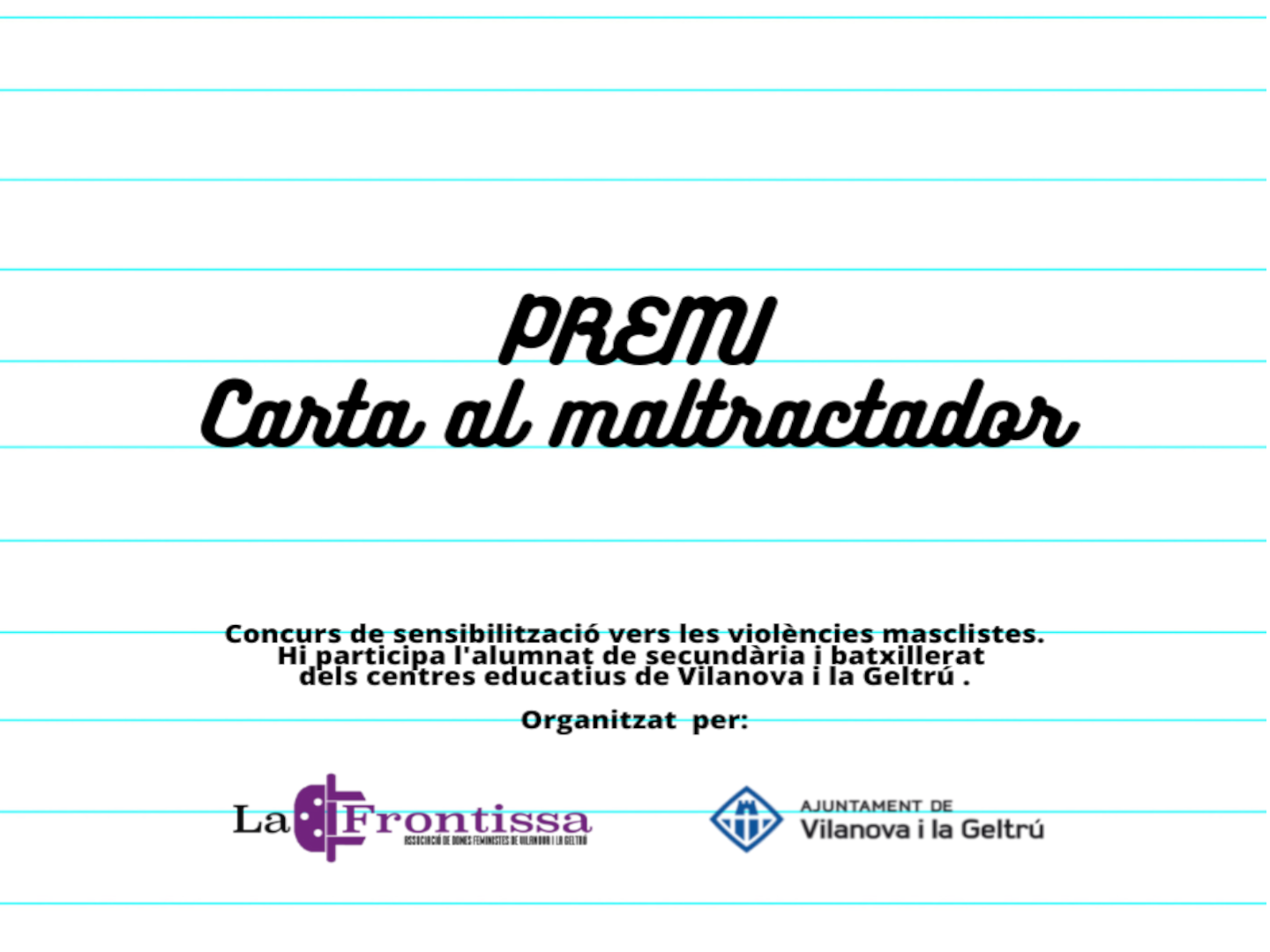 La entrega de premios del PAE Carta al Maltractador es un evento especial que organizan con cariño la Associació de Dones Feministes La Frontissa y el Ajuntament de Vilanova i la Geltrú. ¿El objetivo? Concienciar a nuestros jóvenes sobre la violencia machista a través de la escritura. Se trata de una invitación a que plasmen sus pensamientos y sentimientos en una carta original e inédita, que no haya recibido premios en otros concursos. Este certamen busca despertar reflexiones y generar un cambio desde las palabras, porque creemos que cada letra tiene el poder de transformar. Ven y sé parte de esta iniciativa que pone al centro el respeto y la igualdad.